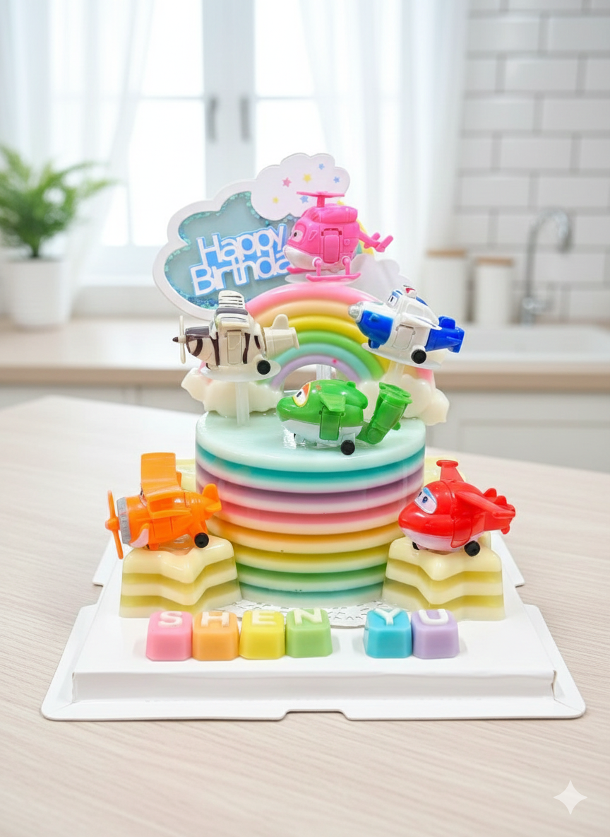 A vibrant rainbow jelly stack crowned with cute flying pals.