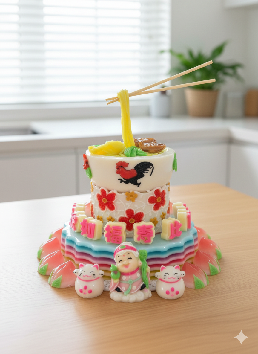 Longevity noodles and fortune symbols stacked in a colorful jelly tower.